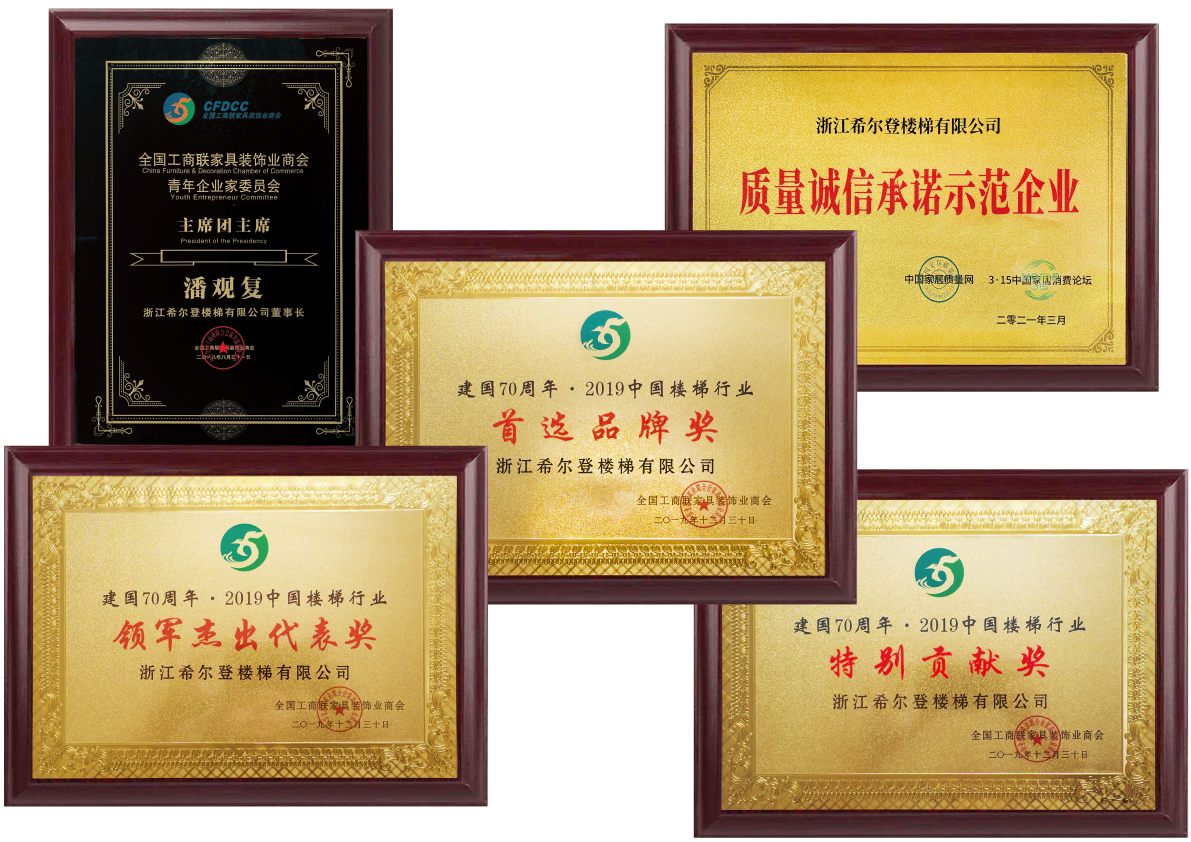 在不斷提升希爾登品牌和企業(yè)實力的同時,希爾登一直熱心參與樓梯行業(yè)的健康發(fā)展;參與創(chuàng)立全國工商聯(lián)樓梯專委會并被推選為中國樓梯品牌聯(lián)盟執(zhí)行主席和樓梯專委會執(zhí)行會長;憑借在行業(yè)內(nèi)的專業(yè)地位,希爾登參與了《木質(zhì)樓梯》,《木質(zhì)樓梯安裝驗收和使用規(guī)范》,《住宅內(nèi)用樓梯》,《建筑用玻璃與金屬護(hù)欄》四個國家和行業(yè)標(biāo)準(zhǔn)的起草工作。先后榮獲“中國樓梯十大品牌”、“金木樓梯領(lǐng)軍品牌”、“中國泛家居發(fā)展中企業(yè)500強(qiáng)”、“中國家裝行業(yè)金鉆獎”、“金屬木質(zhì)樓梯一級資質(zhì)”等二十多個榮譽(yù)和稱號。我們幾乎參與和見證中國樓梯發(fā)展歷程中的所有重大事件。希爾登過去,現(xiàn)在和未來都是中國樓梯的標(biāo)桿企業(yè)。